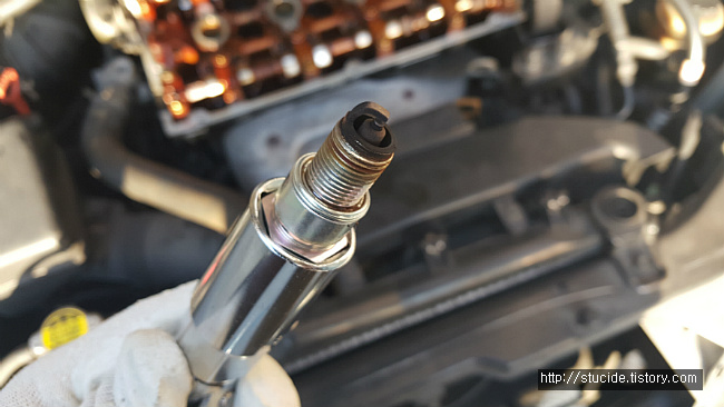 2018년 01월 03일 헤드커버 가스켓(잠바가스켓) DIY 교체 하면서 확인한 점화플러그의 상태는 하나의 점화플러그만 검게 그을려 있었다. 당시 초기 시동시 머플러의 흰매연이 심하여 그을린 점화플